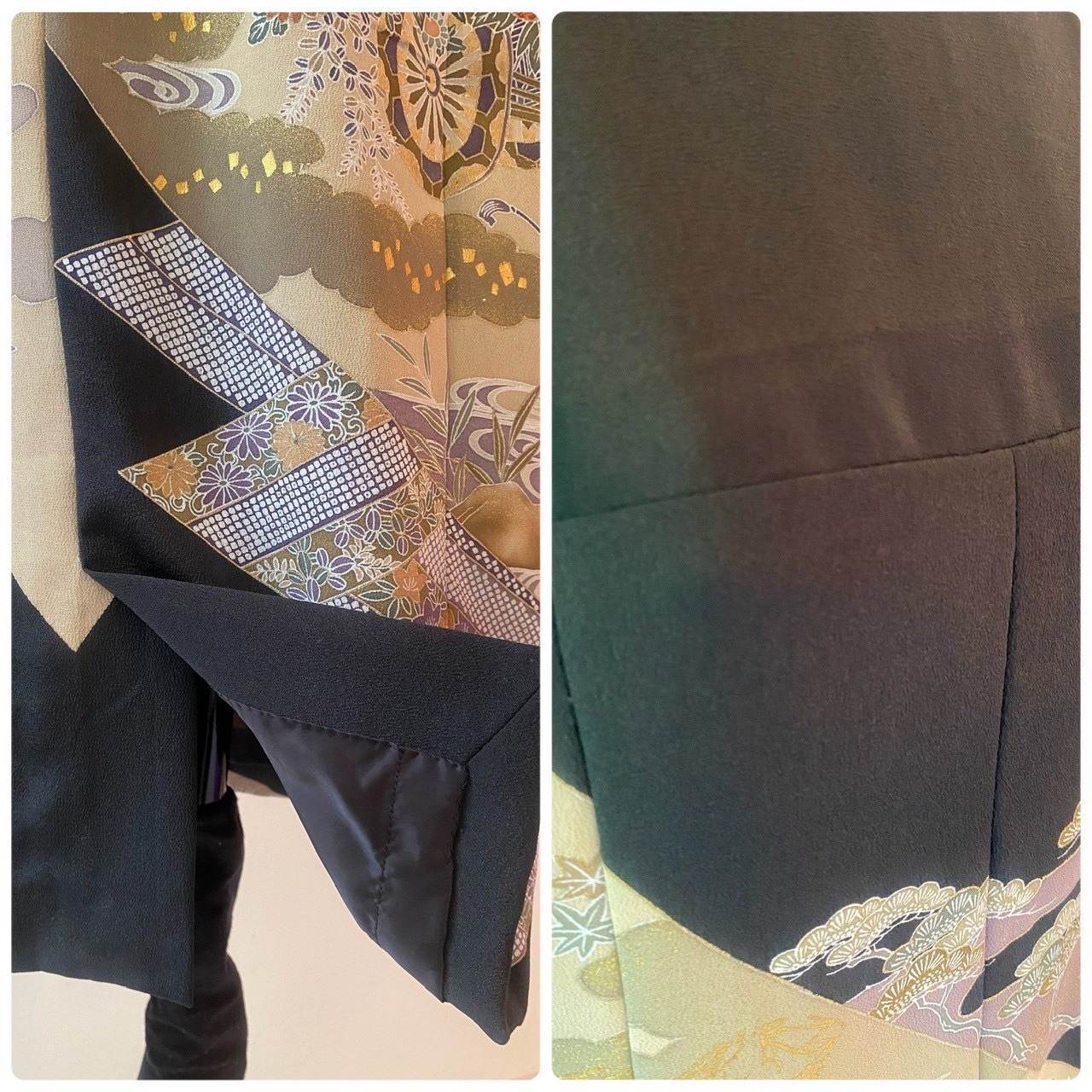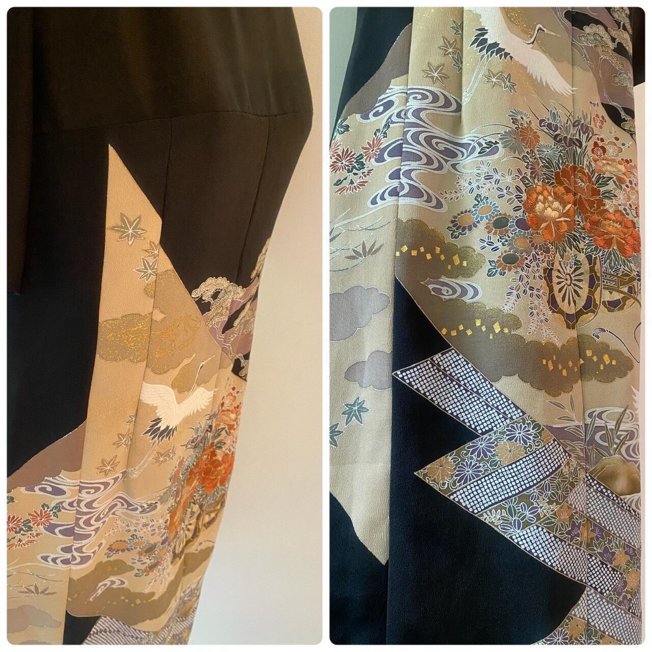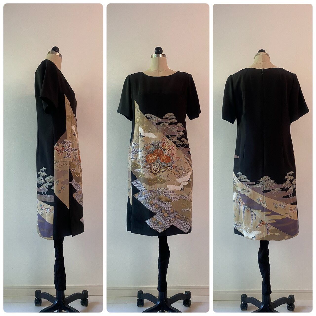 サイズL 御所車と秋草模様が織りなす美しいKIMONOワンピース