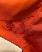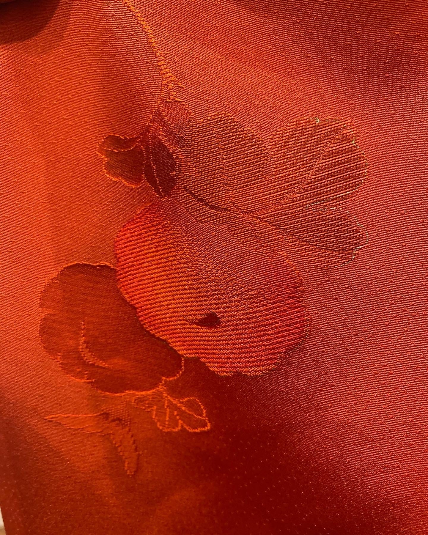 美しい光沢で素敵なレンガ色に染められています。織りによって表現した柄は、作り手の控えめな表現方法でかなり手間暇かかっているもの。